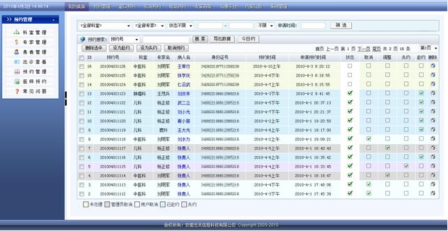 3、 預(yù)約確認(rèn)后,生成預(yù)約號,就診時,需憑預(yù)約號領(lǐng)取門診號就診。 后臺管理功能描述 1、 修改、取消患者預(yù)約信息。 2、 領(lǐng)取門診號后,需銷號。(建議在門診系統(tǒng)的操作界面中套嵌銷號界面,且留有數(shù)據(jù)接口) 3、 統(tǒng)計、查詢功能:可根據(jù)管理的需要,隨意進(jìn)行各類定制的統(tǒng)計和查詢。